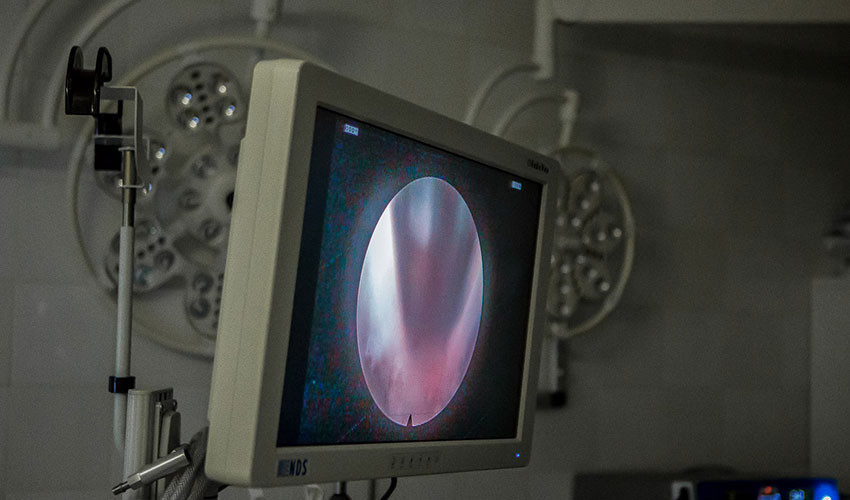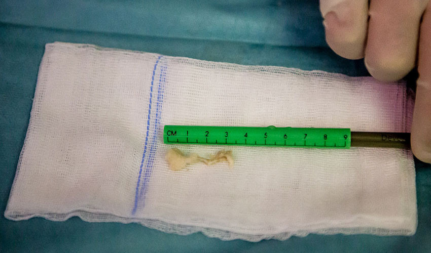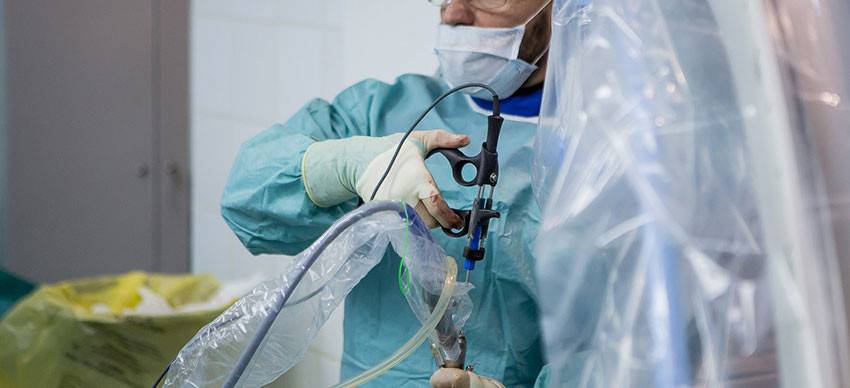 11. Собственно, этап удаления грыжи. Врач взял грыжу специальными микрокусачками и удаляет её через эндоскоп под непрерывным визуальным контролем.