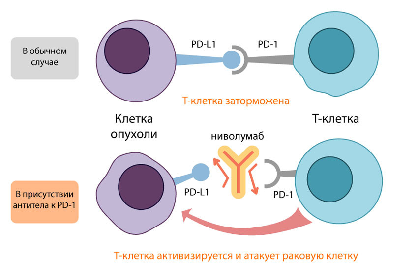Схема работы иммунопрепарата, ингибитора PD-1. Именно за это открытие Тасуку Хондзе получил Нобелевскую премию. Он нашел на поверхности Т-клетки (клетка иммунитета) молекулу PD-1 и выяснил, что PD-1 переводит Т-клетку в «спящий режим», когда связывается с соответствующим белком PD-L1 на поверхности опухолевой клетки. А препарат-ингибитор PD-1 размыкает эту связь и снова активирует Т-клетки на уничтожение клеток опухоли.